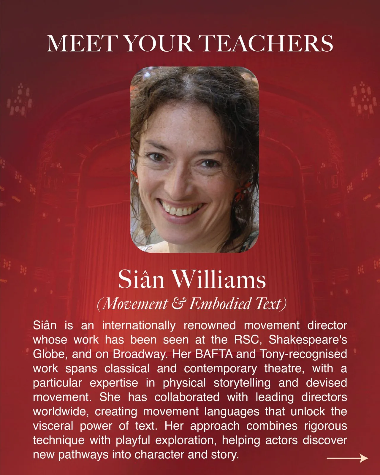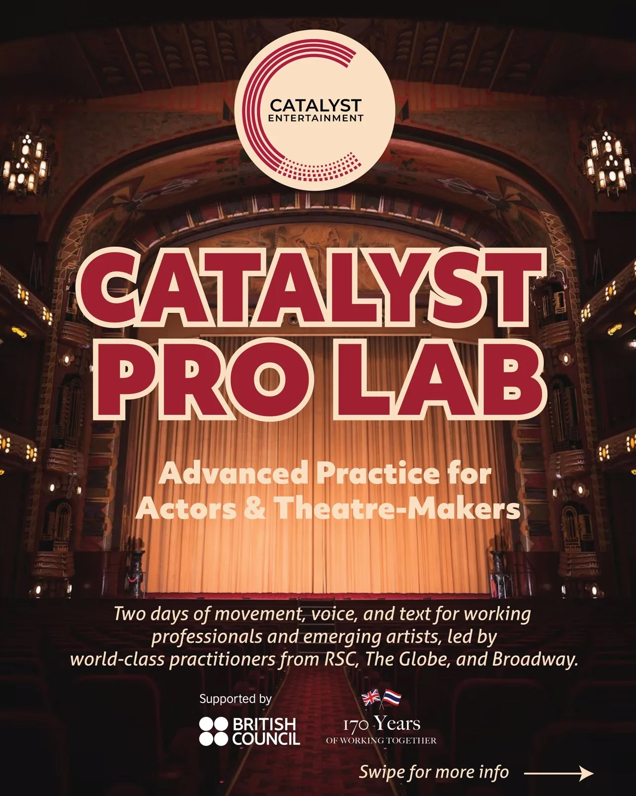 Led by Siân Williams (Royal Shakespeare Company, Broadway), James Oxley (Shakespeare’s Globe), and Reuben Grove (West End), Catalyst Pro Lab offers an immersive two-day professional development experience. Participants will work directly with world-class practitioners to refine technique, expand creative range, and leave with fresh tools for stagecraft and teaching.