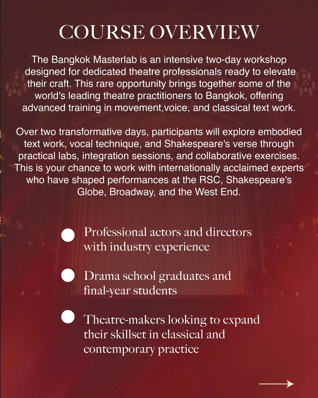 Professional actors, drama educators, theatre practitioners, and senior year students and drama school graduates.