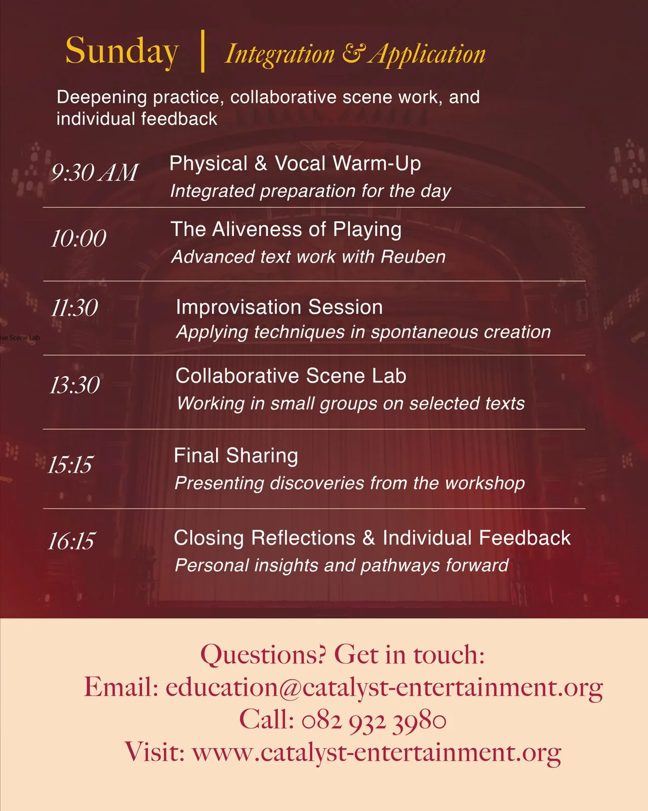 The Catalyst Pro Lab also serves as an advanced CPD opportunity for drama educators, offering practical, proven techniques to integrate into classroom and rehearsal settings.